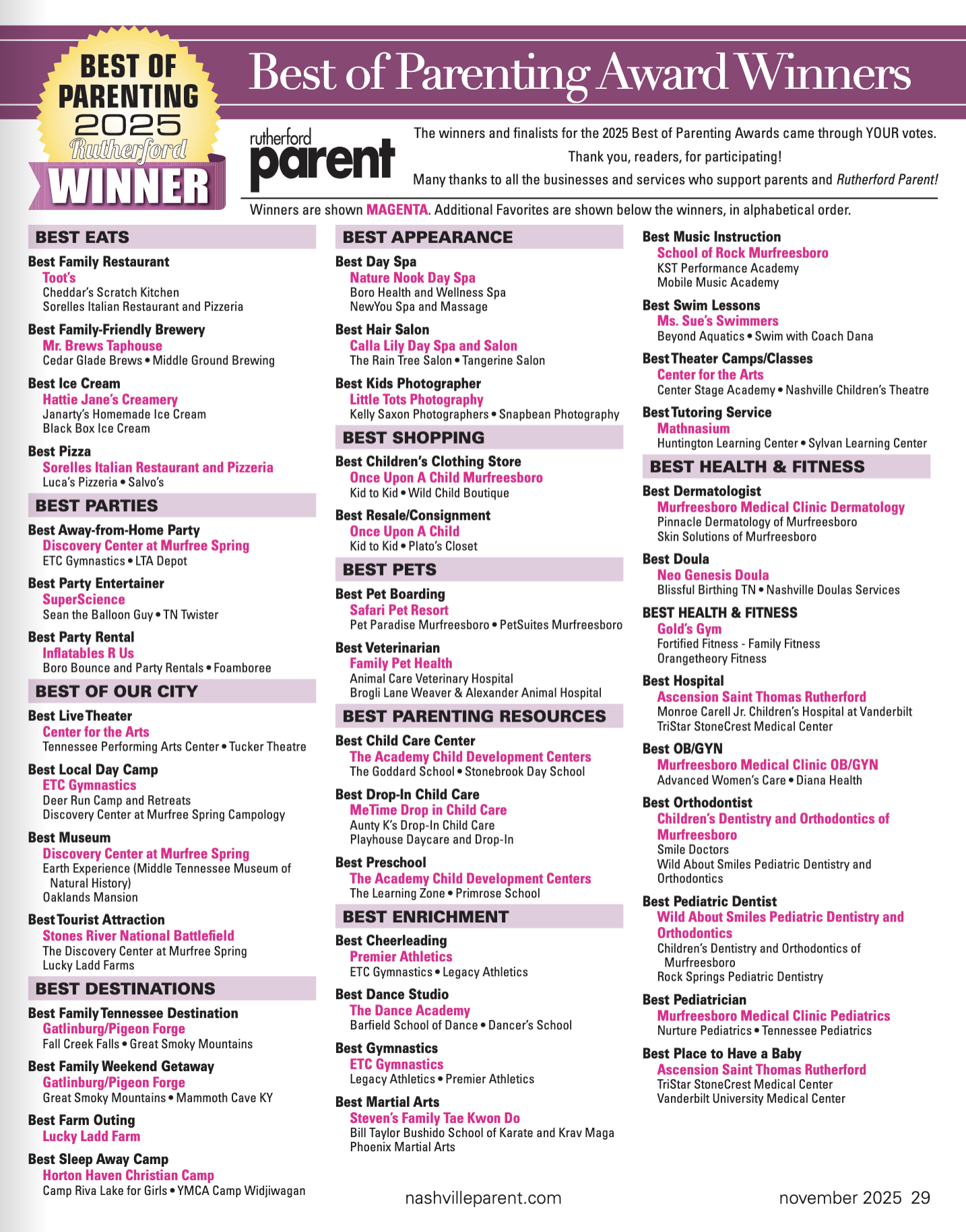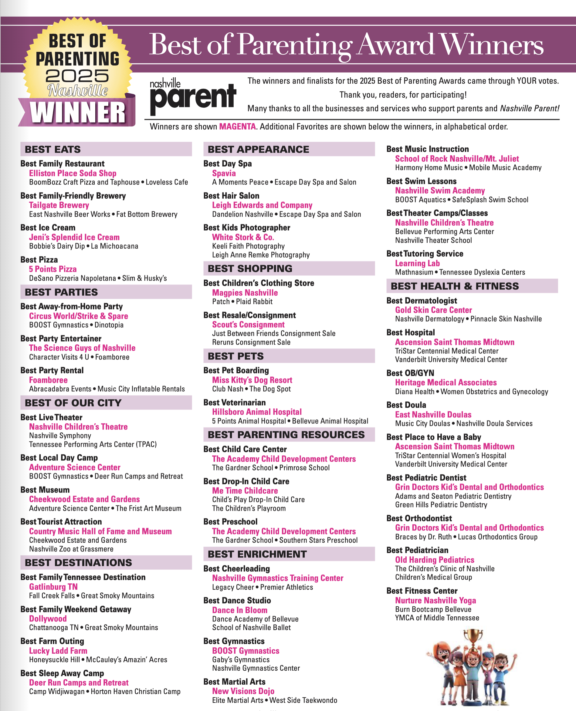 We asked and you told us who your Middle Tennessee favorites are in DROVES! Nashville Parent received thousands of votes for the Best of Parenting 2025 from you, our dear readers. We have your favorite places to visit, restaurants, schools, medical and the list goes on and on. PLUS, you can find all of the categories online at Nashvilleparent.com. Congratulations to all of the nominees and winners and without further adieu — here they are!