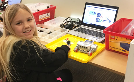 The children are each given their own dedicated workspace, complete with a laptop. They are set up with a Lego Mindstorm set and software to follow step-by-step instructions. After putting it together, they can completely customize the robot themselves using software on the laptop. They have the option to add specific sounds and faces on the electronic display. In addition, they can program movements and add infrared sensors. It was amazing to see how quickly they caught on to the technology and how it kept their attention.