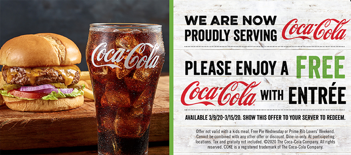 To celebrate the new relationship, O'Charley's guests who dine through Sunday, March 15 will receive a free Coca-Cola beverage of their choice with the purchase of an entree (dine-in only; excludes kids' meals). Simply show the digital ad that pops up on ocharleys.com to your server to redeem your free drinks.