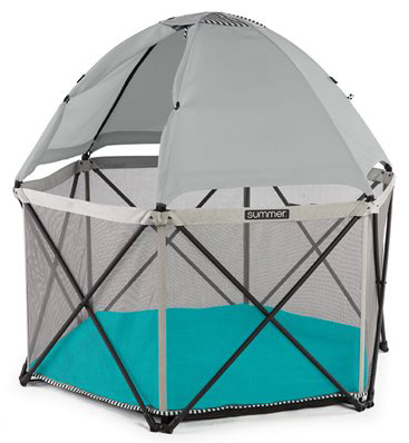 This new compact tent pops up for fast use on the go. It has 14 square feet of play area and an extra padded floor. The full canopy provides UPF 50+ protection. Take it everywhere for your baby ages 6 – 24 months and keep an easy eye on him with the mesh sides, which also allow a cool breeze.