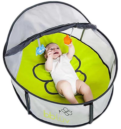 This two-in-one travel play tent is perfect for taking Baby to the beach! It protects from UVA and UVB rays and features a removable mat and two toys. The canopy also has a retractable mesh net to keep mosquitoes away.