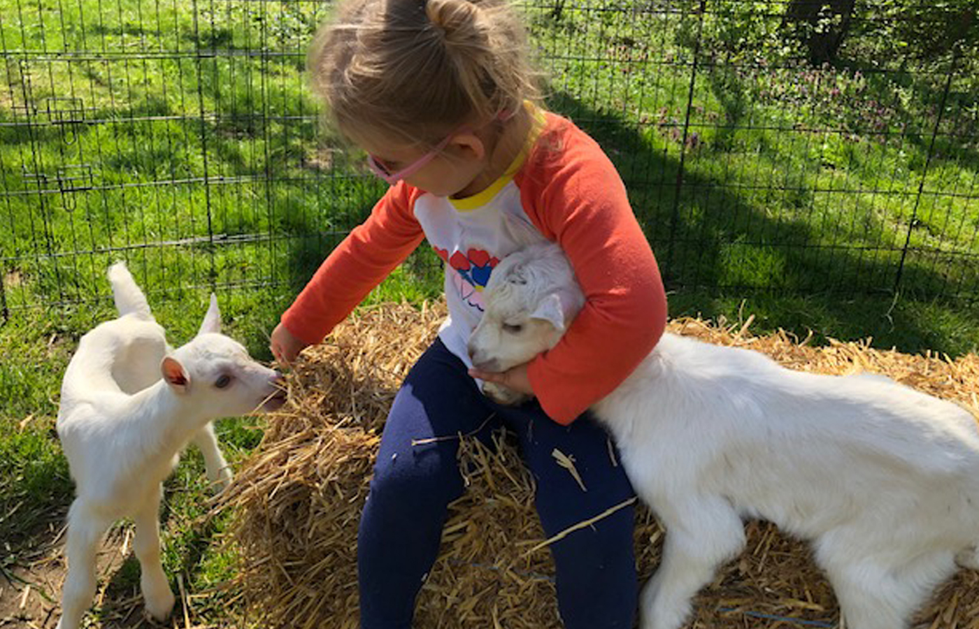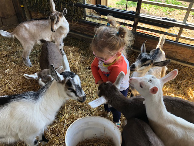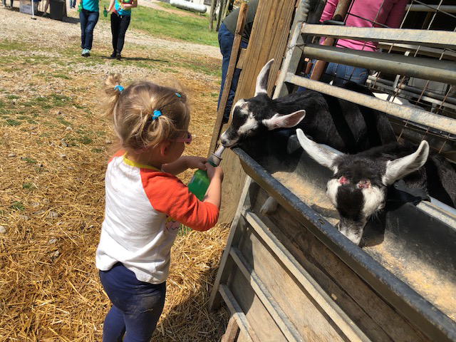 The goats are divided into large corrals. Depending on you and your child's comfort level, you can interact outside the gates or get right in the mix with the goats by entering the corrals. If your children are anything like mine, I would dress for mess in clothes that you're fine with getting dirty; your children will likely be covered in hay, mud and goat hair by the time cuddling is through. Sadie, my 2-year-old, loved the ability to cuddle, feed and play with the goats as if she were on a play date with a friend. If a member of your group or family is a little intimidated, there is a small pen set up with two baby goats that are just one week old. Their sweet size and age is less overwhelming for more timid little ones.