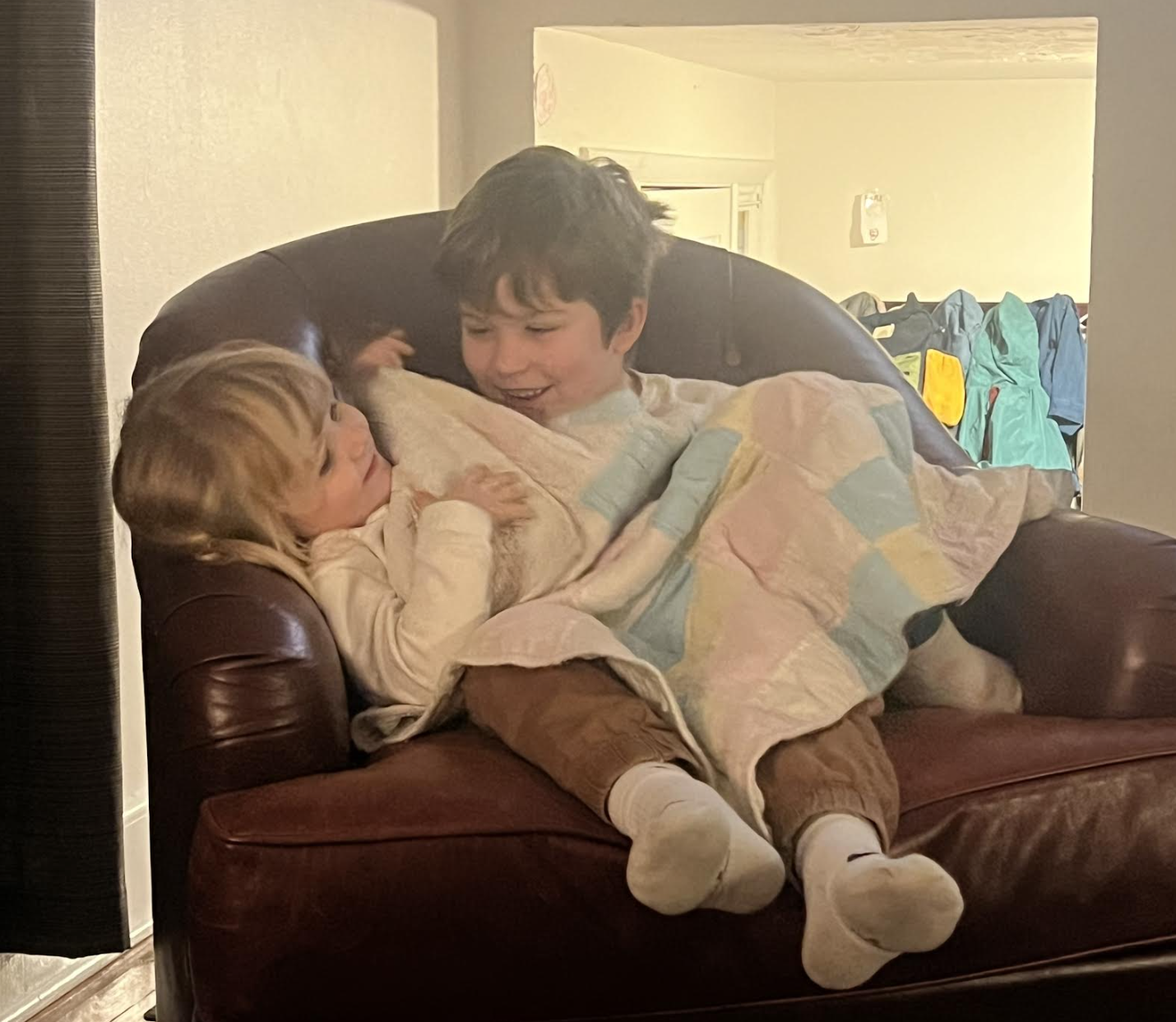 Aldrich’s son holds his little sister as she pretends to be a baby kitten.