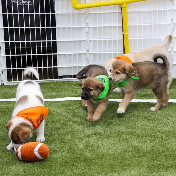 Ten puppies, available for adoption, will hit the field for a big game featuring tail-wagging touchdowns, ruff and tuff tackling, and unbelievable cuteness.
