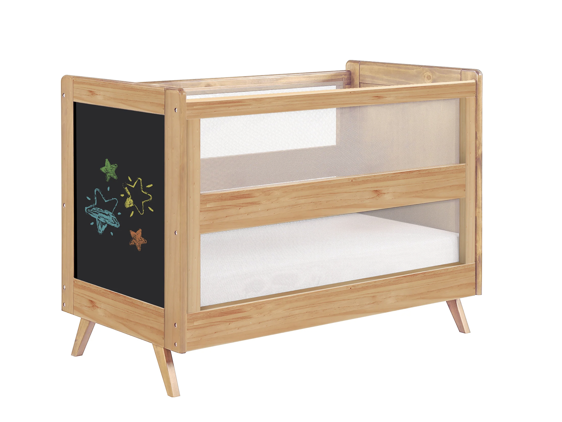 This is the first and only crib that eliminates the risk of legs and arms getting stuck between slats and pacifiers getting thrown out. The 3-in-1 full-size crib has been tested for safe sleep and is non-toxic and eco-friendly. Greenguard Gold certified, the crib fits most full-size mattresses. It also boasts a chalkboard on the side for the coming toddler years!