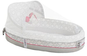 Baby (up to 15 pounds, or until he can push up or roll over on his own) will sleep comfortably in this portable lounger featuring a three-position canopy, removable toys, music box and rotating color light show. It folds up easily and can be carried like a backpack.