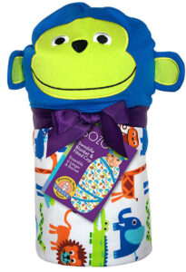 This 40-by-40-inch, super soft swaddle blanket pairs nicely with an accompanying cap to keep Baby warm. It’s great to use as a regular blanket, too. Available in a variety of animals.