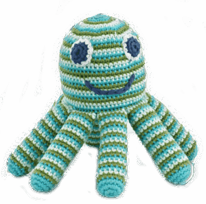 Hand crocheted, this cute octopus has a rattle in it’s head that provides a soft sound for your baby. The legs are easy for Baby to grab, and the fabric makes it a great teething toy, too.