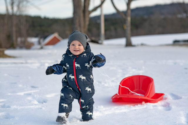 You may be tempted to not disturb your child if he’s sleeping in his car seat, but you don’t want him to get over-heated. “Babies dressed in too many layers (of blankets or clothing) are at greater risk for overheating and for SIDS (sudden infant death syndrome),” reports the AAP, so remember to monitor Baby’s comfort level at all times.  The AAP offers these tips on keeping babies warm outdoors in snowy conditions: